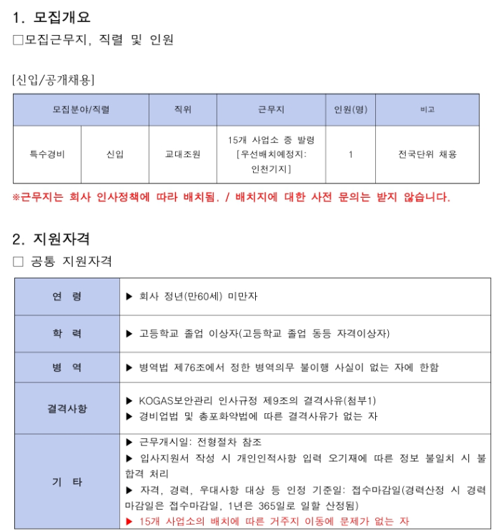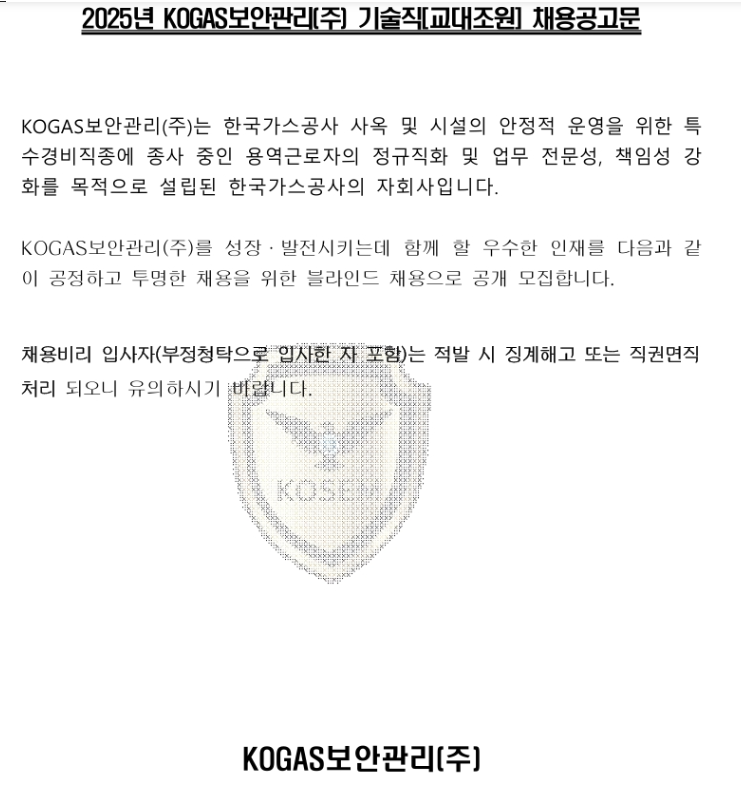 [수정] 2025년 KOGAS보안관리(주) 기술직 정규/계약(교대조원) 채용공고