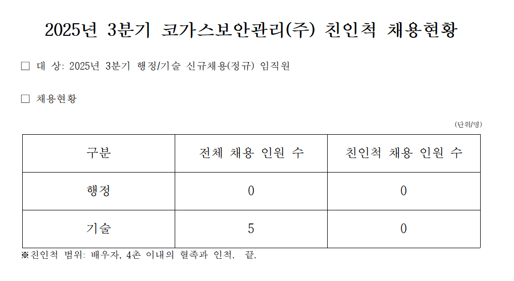2025년 제3분기 코가스보안관리(주) 친인척 채용현황