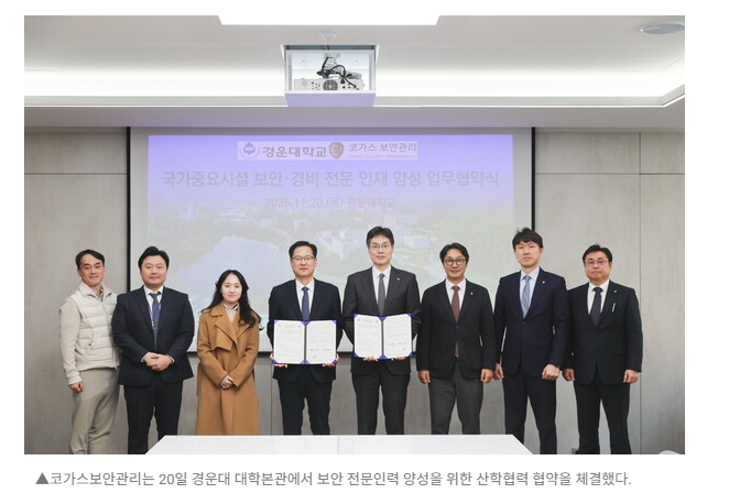 코가스보안관리와 경운대학교는 이번 협약을 통해 △맞춤형 교육과정 개발 및 운영에 대한 자문 및 공동 참여 △국가중요시설 경비·보안 발전 과제의 공동 개발 및 연구 △인적·물적 자원의 상호 교류 및 활용 △경비·보안 분야 현장실습 및 취업 정보 제공 △기타 산학협력 및 상호 이해 증진을 위한 협력 사업 발굴 등 다양한 영역에서 협력을 추진할 계획이다.
